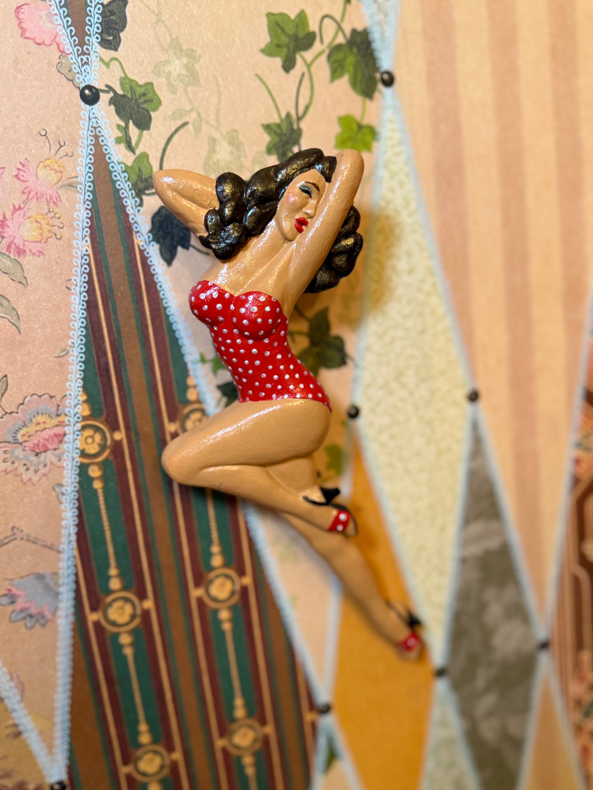 This beautiful moulded pin-up wall hanging is based on a 1950's original. Moulded from stone cast and painted in house, each Brushstroke Bombshell is created to be completely unique. Each pin-up is 1 of 1, making the perfect collectors item for any vintage lover!
