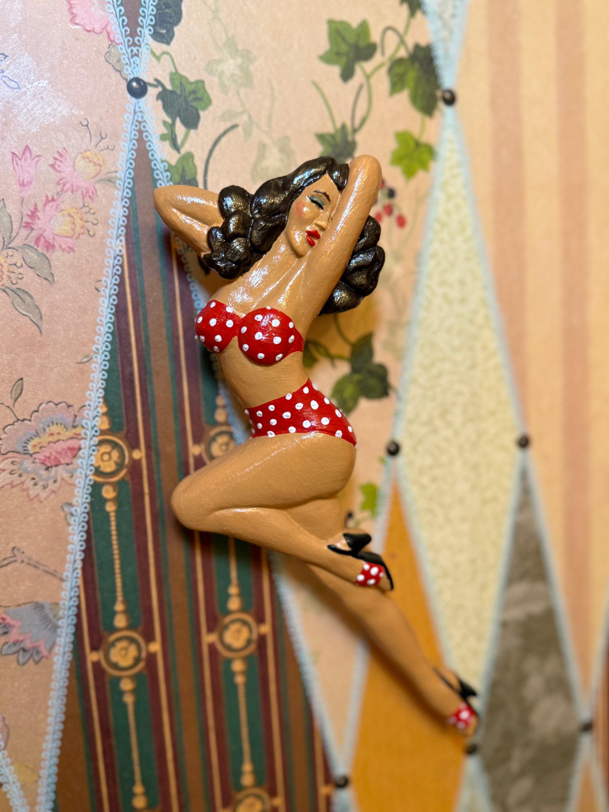 This beautiful moulded pin-up wall hanging is based on a 1950's original. Moulded from stone cast and painted in house, each Brushstroke Bombshell is created to be completely unique. Each pin-up is 1 of 1, making the perfect collectors item for any vintage lover!