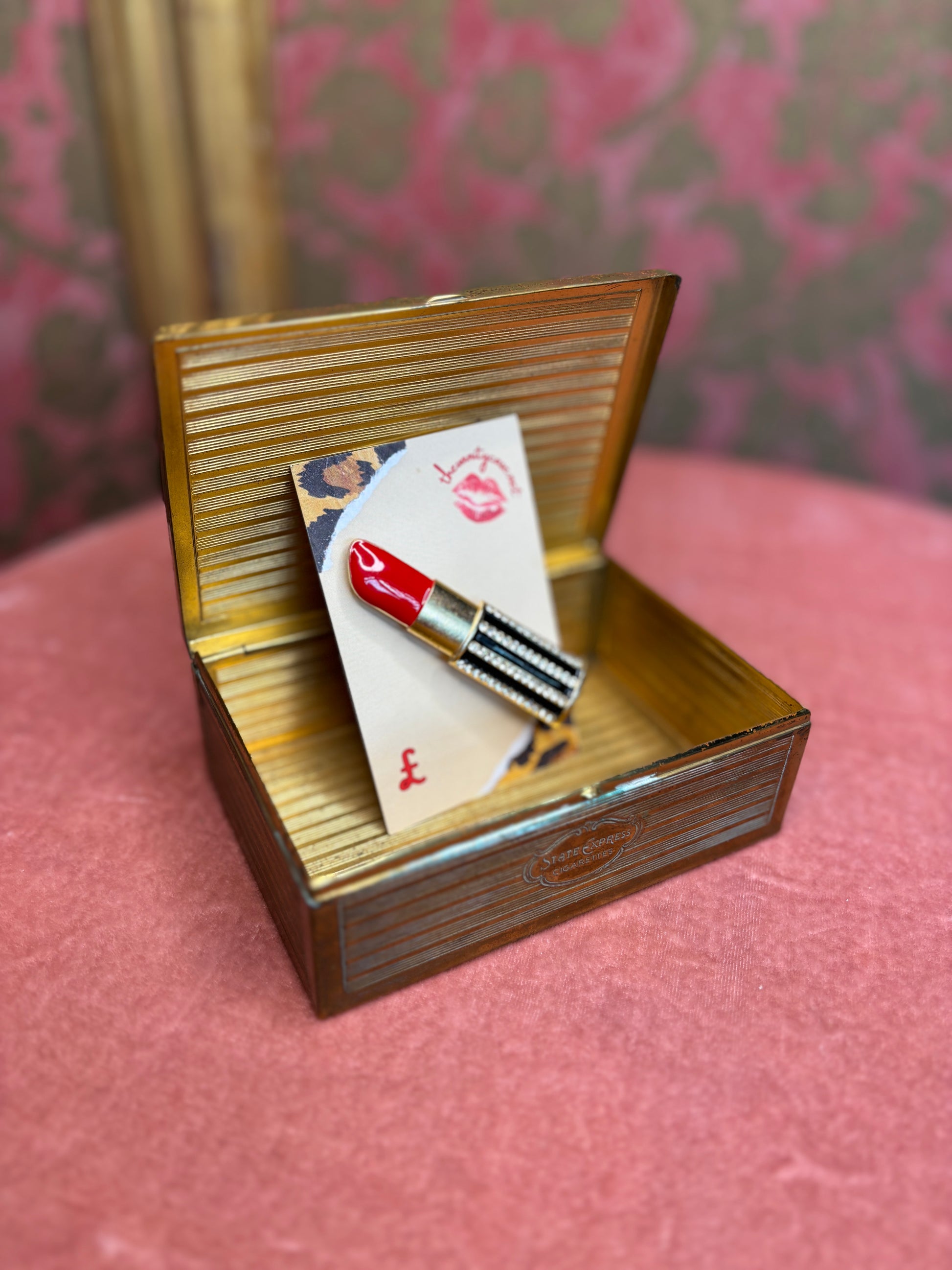 Add a playful touch to your look with the Lipstick Brooch from The Vanity Case. Pin it on your favorite vintage coat or jacket and instantly channel old Hollywood glamour. This charming accessory lets you wear a slice of personality and style wherever you go, making every outfit a little more fun and fabulous.